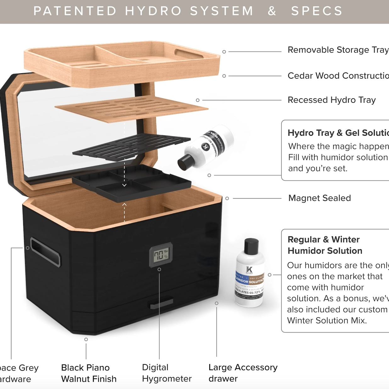 Introducing the Octodor Glass Top Humidor. Years were spent meticulously crafting this humidor to be our best yet. It’s undergone extensive research, testing, and customer feedback to solve every shortcoming commonly experienced with other humidors. Cleverly recessed into the base is the included patent-pending Hydro System, an accurate and low-maintenance cigar humidification system that makes maintaining your humidor easy. This luxe humidor features a striking octagon silhouette, posh black piano finish, glass top, front digital hygrometer, accessory storage drawer, Spanish cedar, and an air-tight magnetic enclosure. We give you everything you need to get up and running with your new Octodor, including the patent-pending Hydro System that contains two humidor solution bottles to help you get started with your seasoning. This is the most comprehensive cigar humidor out there. A striking silhouette and thoughtful engineering makes it a must-have humidor for any aficionado.