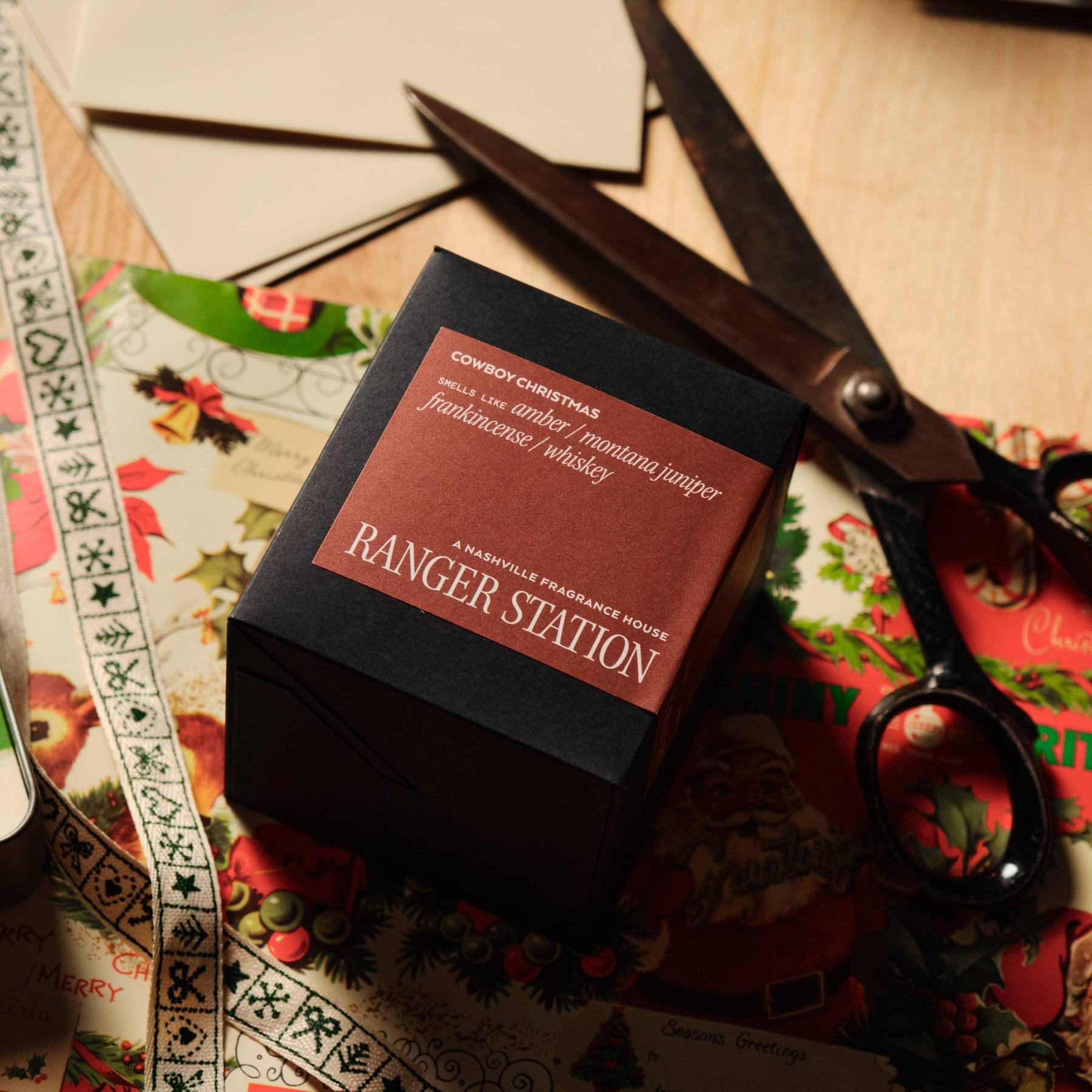 Smells like: amber / Montana juniper / frankincense / whiskey For the most wonderful time of the year, we wanted to create something that would bring all the nostalgic scents of the holidays together like family. Heavy amber and Montana juniper give classic frankincense a Ranger edge, and we round it out with just a touch of the whiskey we know you’re cracking open once the young’uns go to bed. Break out the eggnog and gather ‘round, y’all: it’s Cowboy Christmas. 8 oz. premium soy wax blend Hand-poured & packaged in Nashville, TN 40+ hour burn time Each candle comes with a perfectly paired cocktail recipe to enjoy once the candle is burned through.